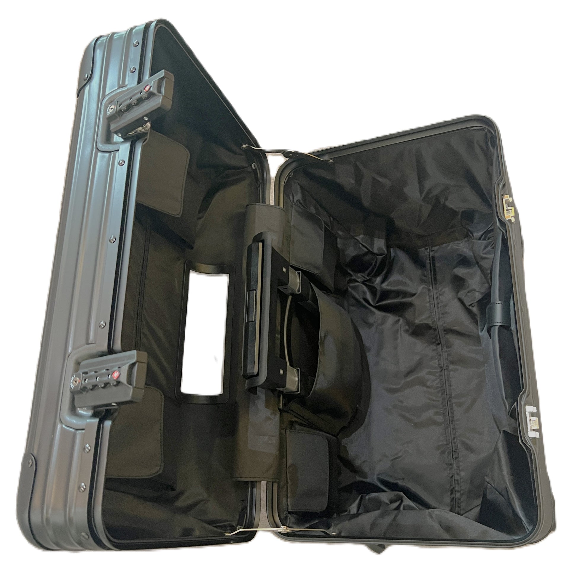 Resolvimos estos requisitos con algo que normalmente sólo la élite de Hollywood o los magnates de Wall Street llevarían: ¡un estuche lateral rígido de aluminio! No más tela de nailon que se rasgue y deteriore. No más bases de fundición pesadas ni bolsas de marco que se deformen. No más bolsillos no seguros y de fácil acceso.