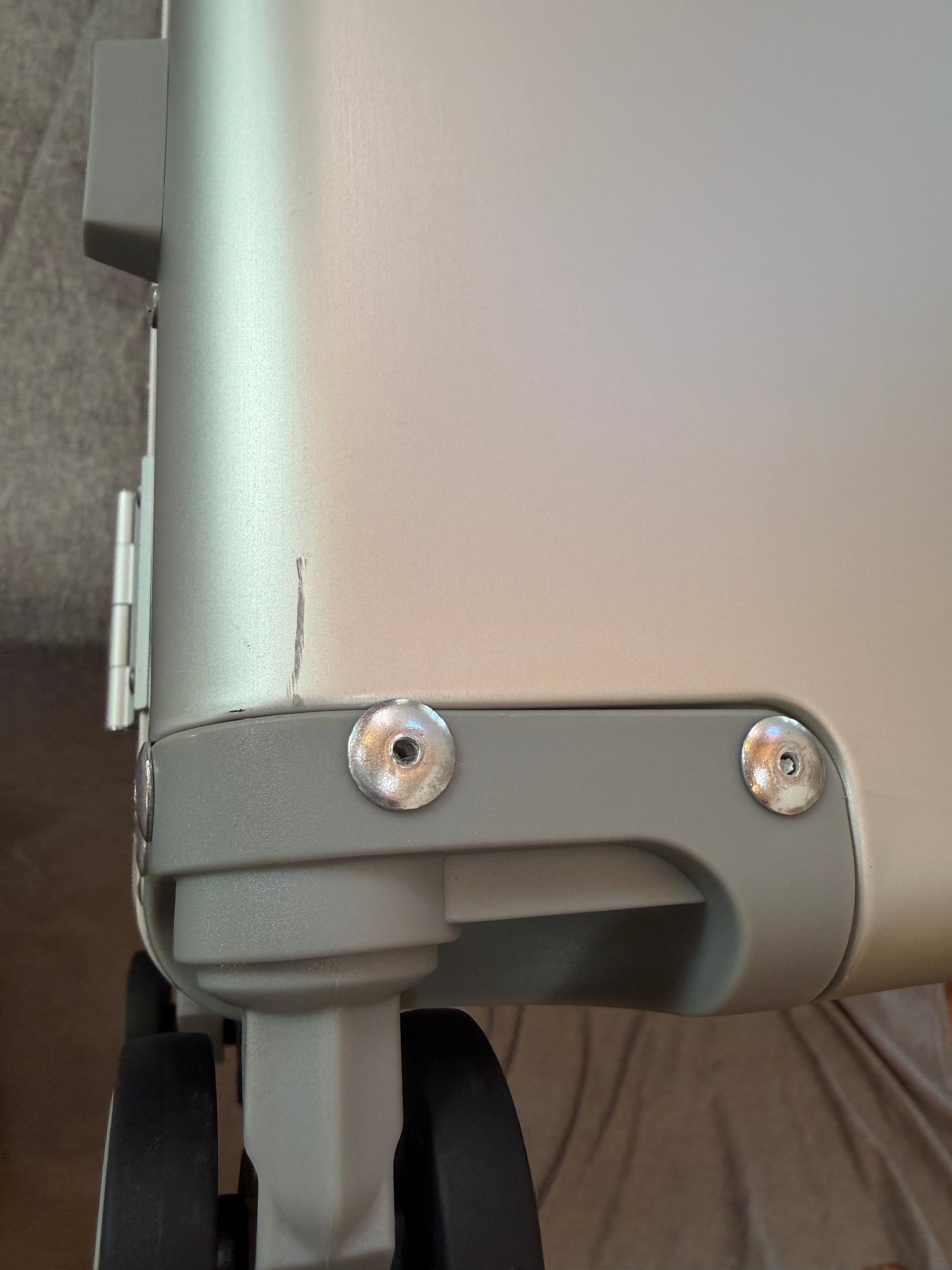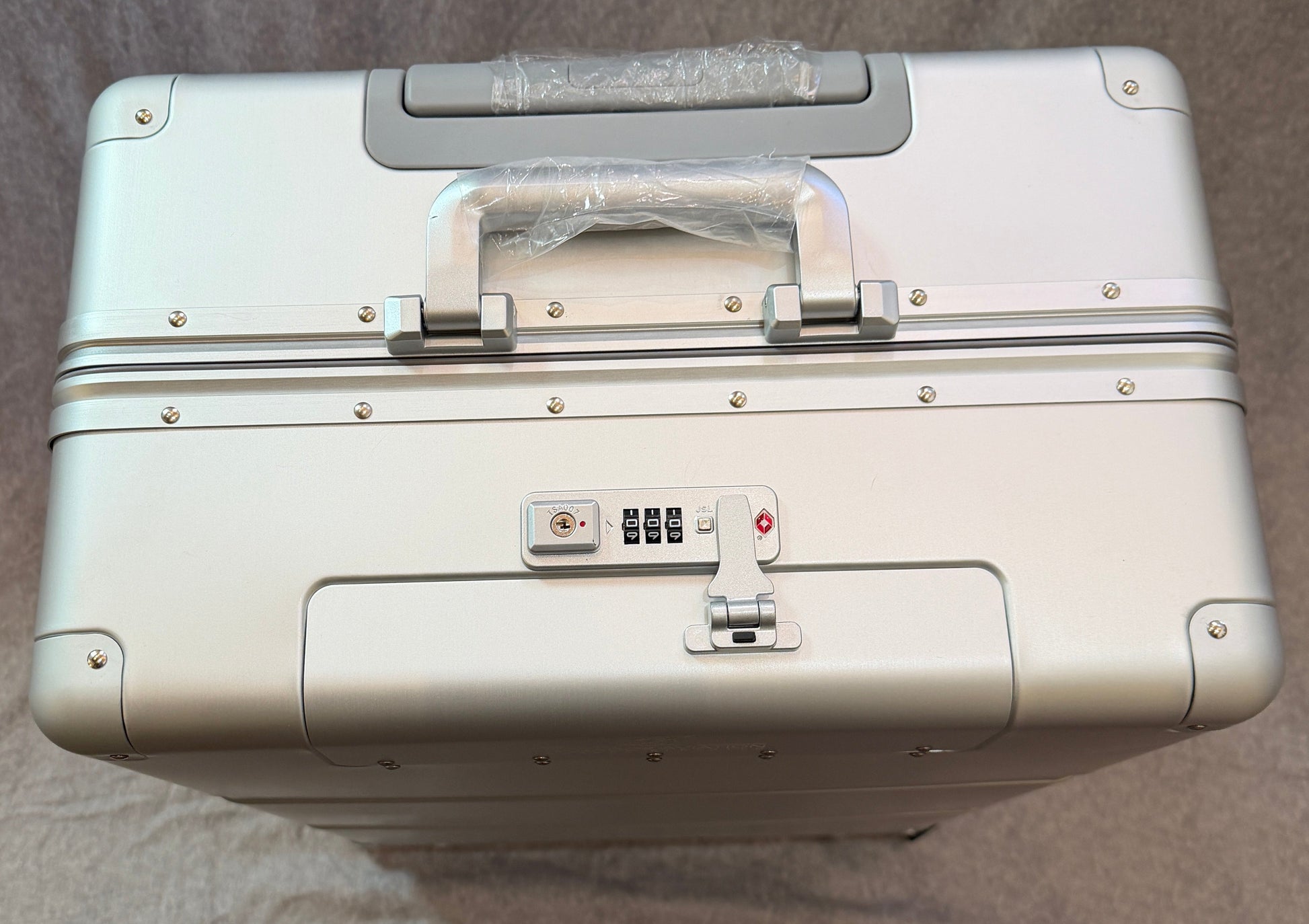 Brand new 25" Leisure Traveler Roll Aboard in Star Light Silver but with a few blems from one of our new 'Rosie Riveter's' learning the ropes. There are also a few scratches and a light ding or two here and there relegating this otherwise brand new case to the Boneyard. Pics tell the tale. Other than the possible light scratch here or there this case will have the same warranty as any other.
