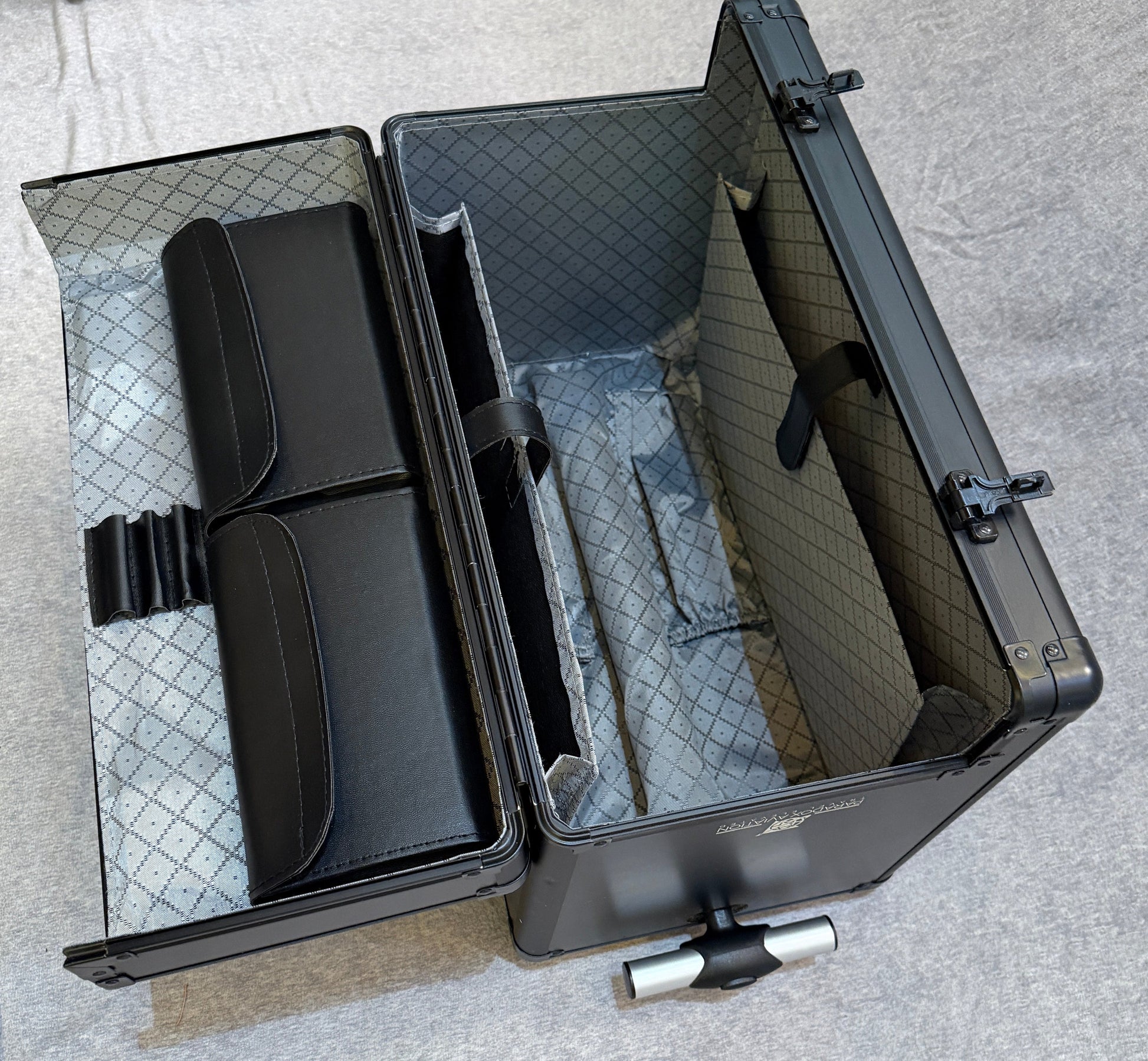 Brand new Prototype Professional Flight Deck Case in Dark Sky Black. This was an early prototype using a single tube retractable handle design VS the production two tube flush handles we use on our production cases. We abandoned this design because the handle was not able to be flush with the case dimensions adding external size to the case. This case is also larger than our production case and if used in the flight deck will be hit by the seat when slid all the way to the side in Boeing aircraft. Airbus pilots should not have any issues with this case in the flight deck. Neat design that never made it to production but a great deal in the Boneyard. There might be a bump or scratch here and there from testing. No warranty on this case since we do not stock the parts of this one off prototype.